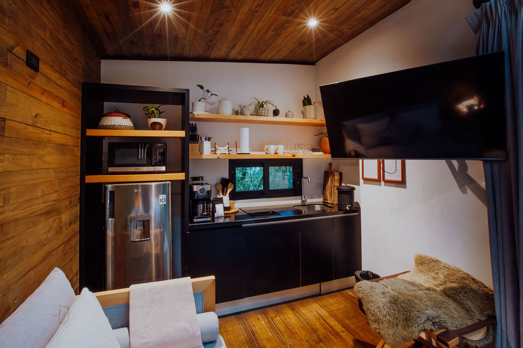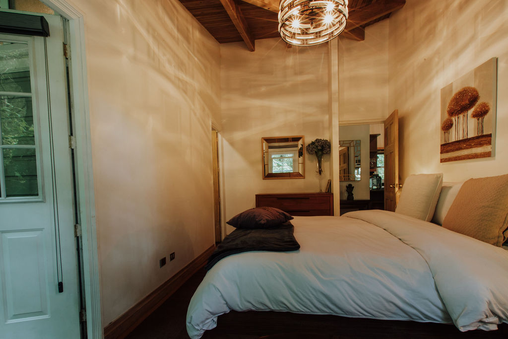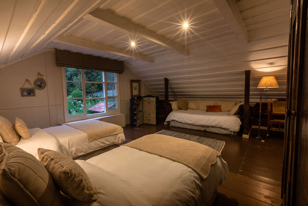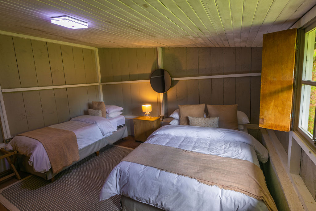 Casa del Bosque Nuestra pequeña casa para familias o grupos pequeños que disfruten de la naturaleza. Rodeada de bosque de ciprés, pino y pinabete, y ubicada en la parte alta de la propiedad, posee la mejor vista de toda la propiedad, directa a nuestro Molino y Capilla. Diseñada para 4 personas. Posee dos